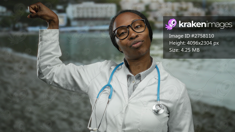 Woman doctor in white coat with stethoscope posing confidently on beach showing strength and empowerment near seaside outdoors in vibrant atmosphere.