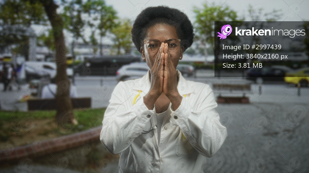 Woman doctor in white coat with stethoscope presses hands to face, glasses visible, on street by waterfront; relief resilience hope.