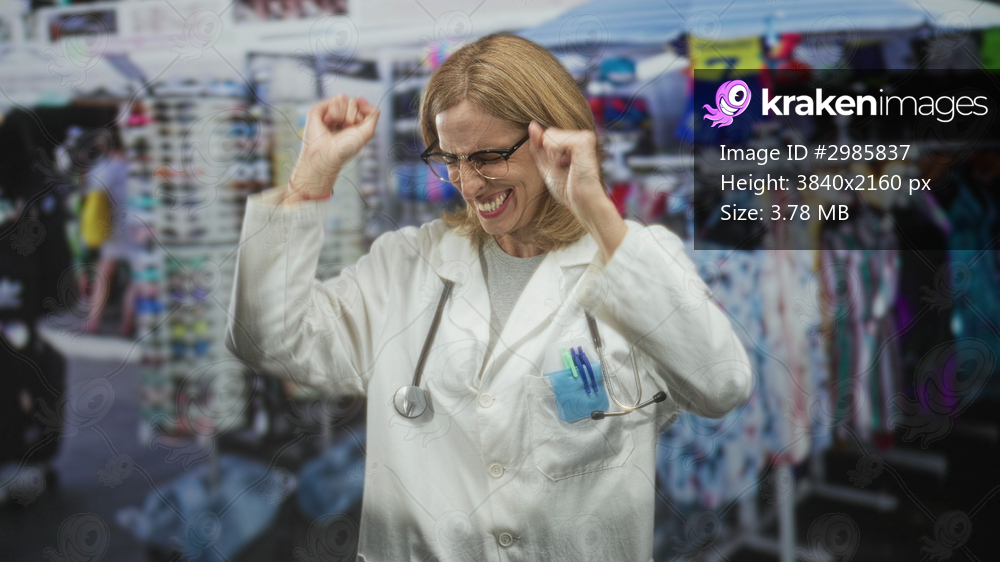 Woman doctor in white coat with stethoscope pumping raised fists and smiling amid clothing racks in a building; celebration joy triumph.