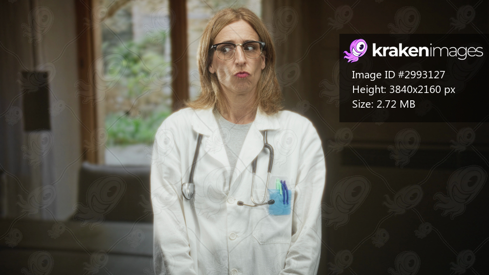 Woman doctor in white coat with stethoscope purses lips in a clinic building, pens in pocket and glasses visible; skepticism.