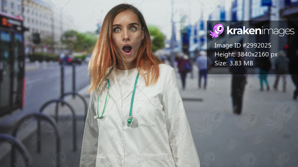 Woman doctor in white coat with stethoscope raises hands open palms on a busy city street in front of bike racks and storefronts; surprise alarm.