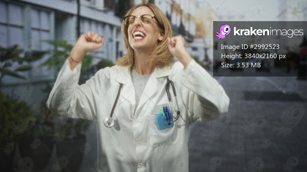 Woman doctor in white coat with stethoscope raises hands and smiles on a city street; joy relief success.