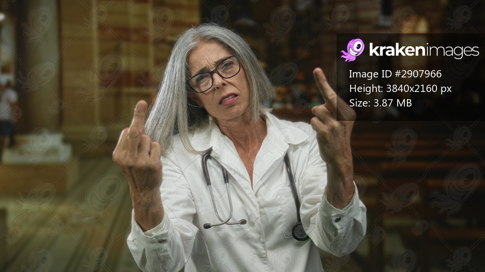 Woman doctor in white coat with stethoscope raising middle fingers inside a church building;defiance protest.