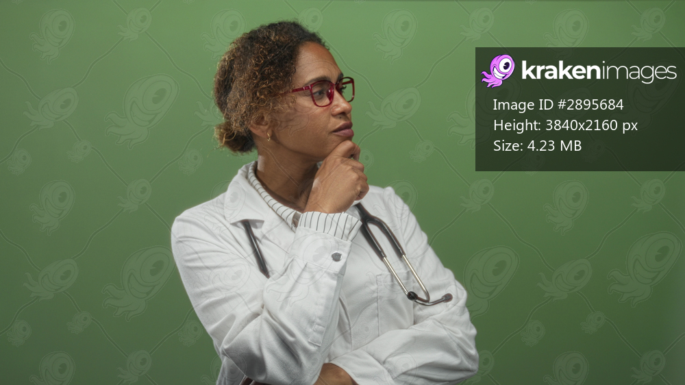 Woman doctor in white coat with stethoscope and red glasses holding chin in a thinking pose in a green studio setting; thoughtful reflection care.