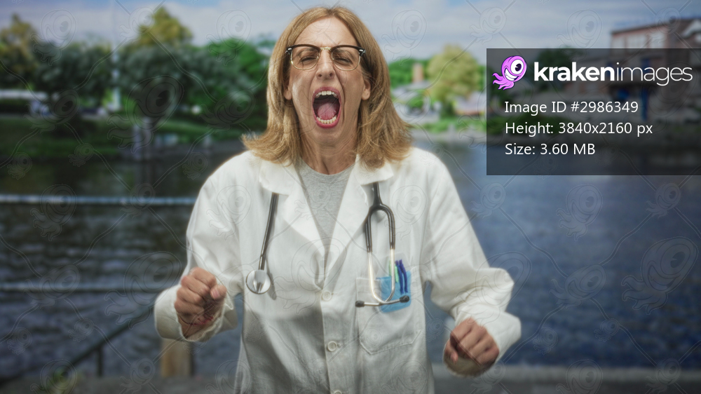 Woman doctor in white coat with stethoscope shouting with open mouth and hand to forehead at riverside building, pens in pocket; medical frustration.