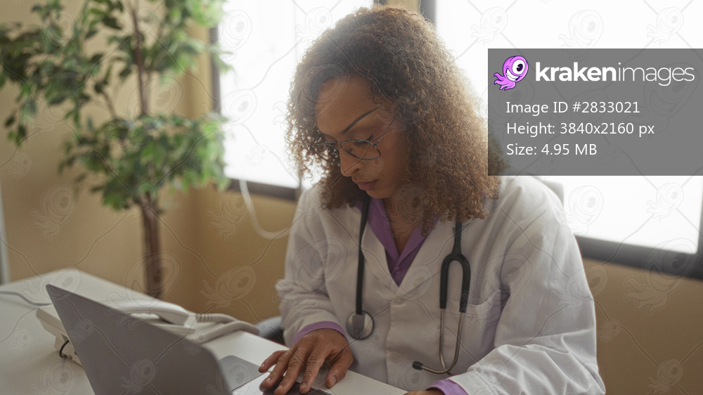 Woman doctor in white coat with stethoscope types on laptop while seated at desk in clinic; focus determination perseverance resolve.