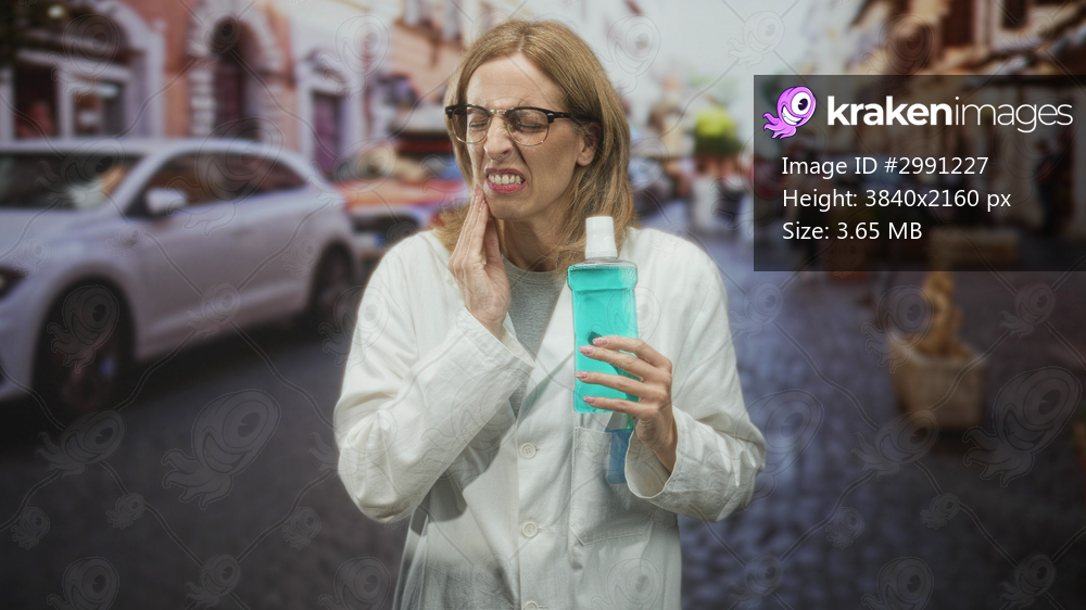 Woman doctor in white coat wearing glasses holds blue mouthwash bottle and clutches cheek in street; toothache pain.