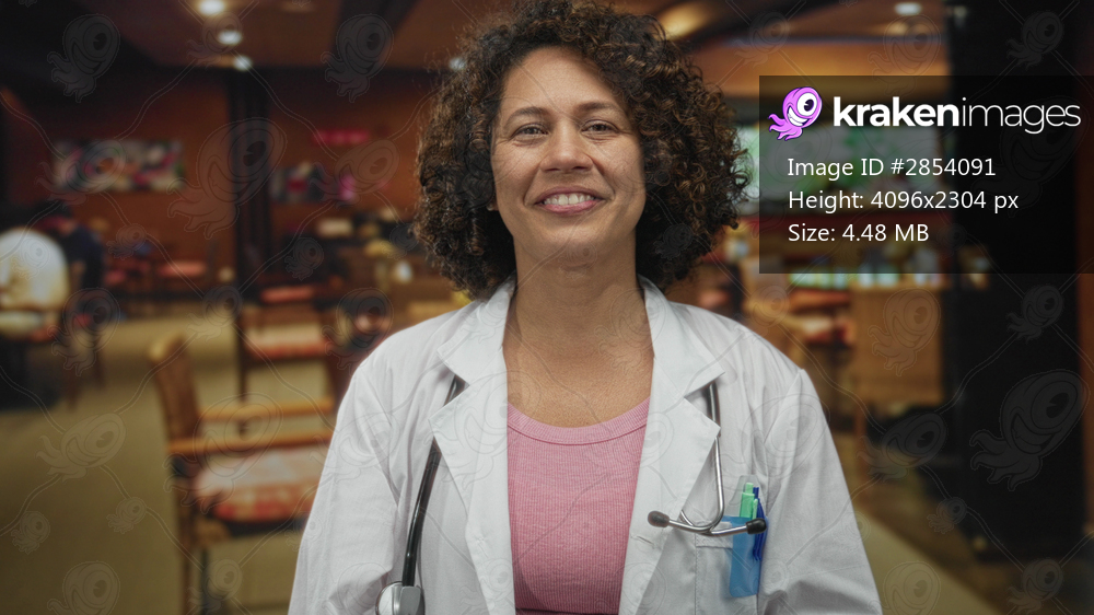 Woman doctor in white coat wearing stethoscope smiles in a restaurant building interior; confidence.