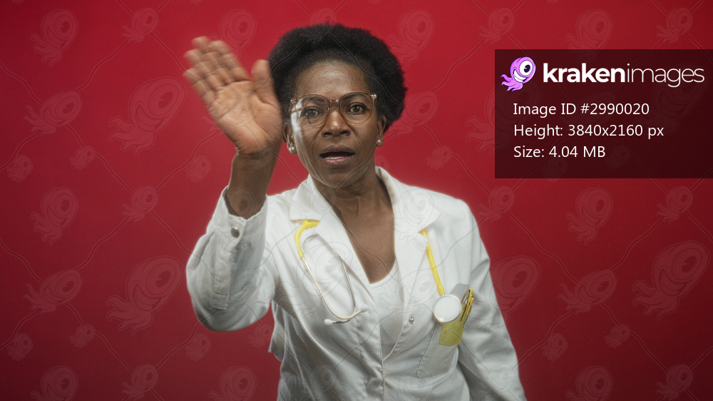 Woman doctor in white coat with yellow stethoscope points thumbs to chest and raises hands in studio with red backdrop; confidence care.