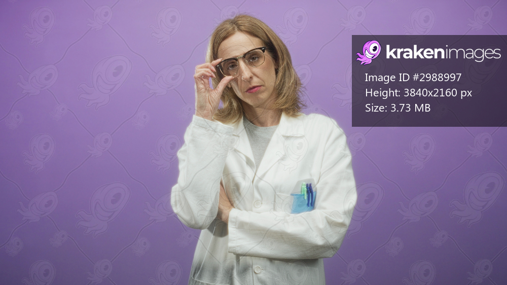 Woman doctor in white lab coat adjusts eyeglasses with hand, pens visible in pocket, posed against purple studio backdrop; skepticism authority.