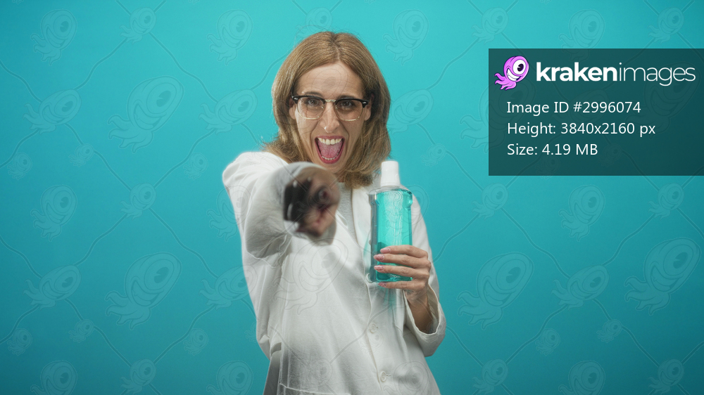 Woman doctor in white lab coat and glasses offers mouthwash while beckoning with hand in studio; friendly oral care.