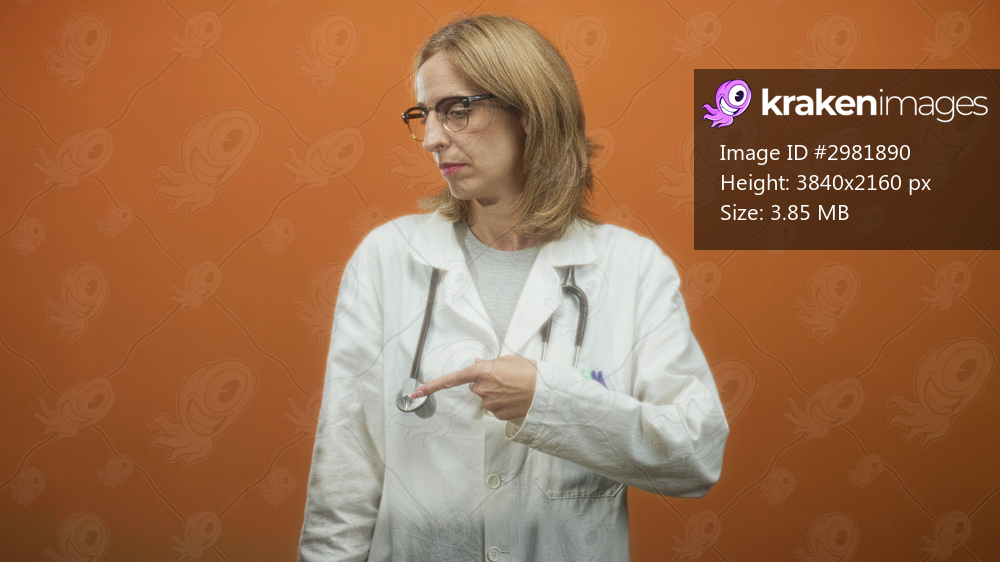 Woman doctor in white lab coat and glasses points finger at stethoscope and pens in chest pocket in studio; wry skepticism.