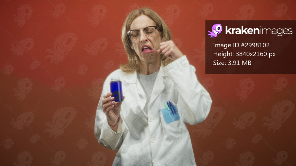 Woman doctor in white lab coat holding a blue bottle, pinching nose in studio; safety concern disgust.