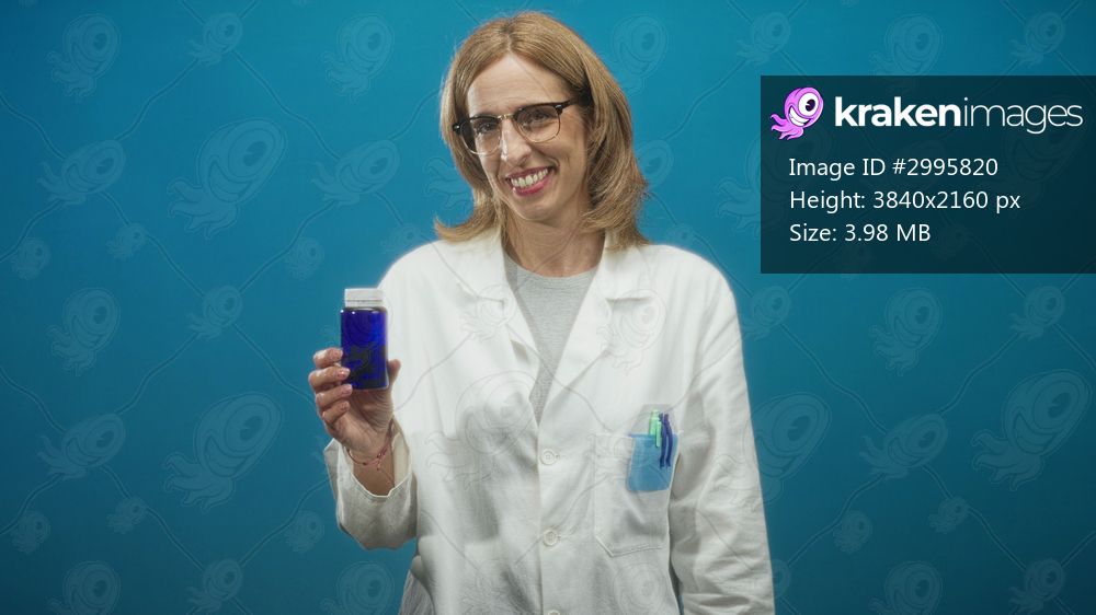 Woman doctor in white lab coat holds a blue medicine bottle up and smiles while showing pills near pocket in a studio; trust.