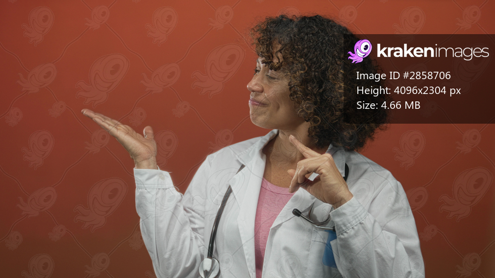 Woman doctor in white lab coat holds stethoscope and makes subtle ok gesture in studio setting; confidence.