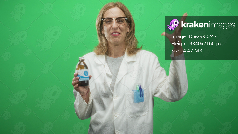 Woman doctor in white lab coat holds syrup bottle, fingers to lips tasting medicine with glasses and pen pocket in studio; reassurance.