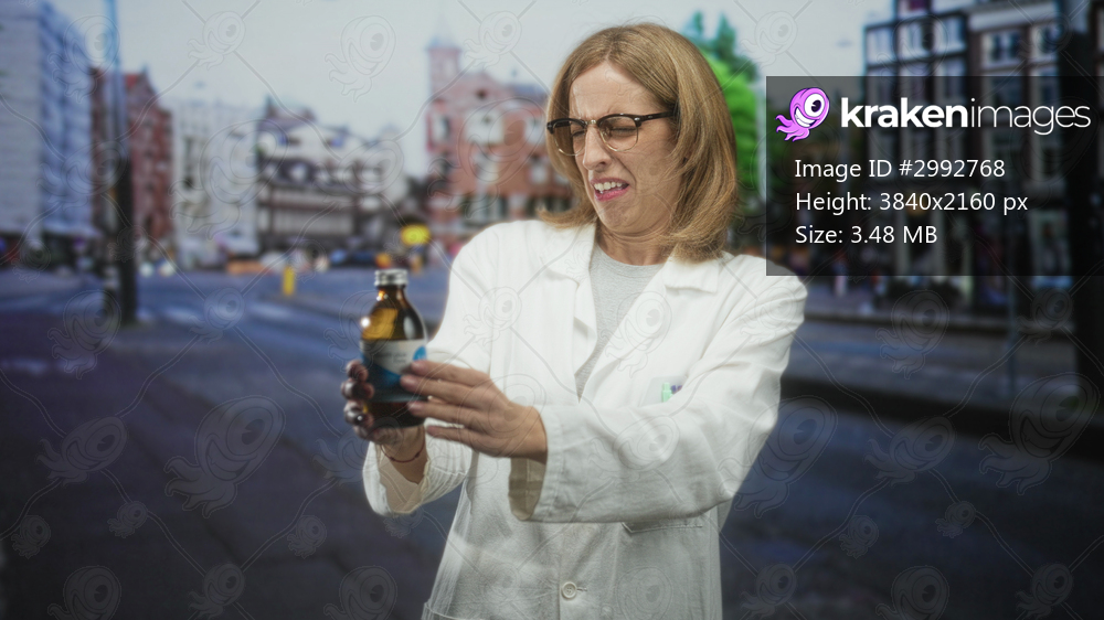 Woman doctor in white lab coat holds syrup medicine bottle with bare hands and grimaces while inspecting the label on a busy street; safety concern disgust. - Kraken Images