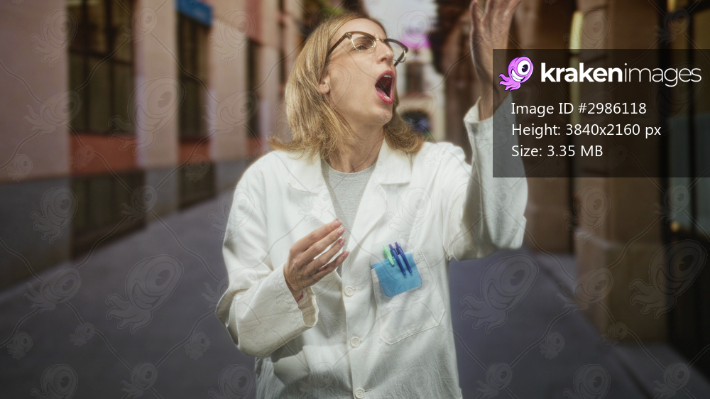 Woman doctor in white lab coat raises hand to mouth with open mouth on a narrow street, appearing to blow or catch something from her hand; surprise curiosity. - Kraken Images