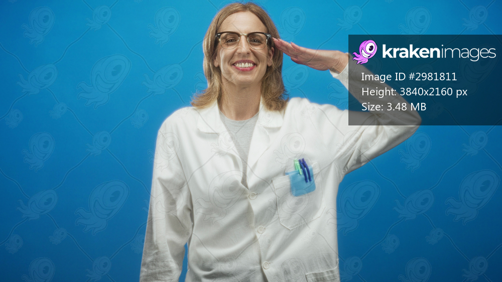 Woman doctor in white lab coat smiles and salutes with right hand, pens visible in chest pocket, posed against a blue studio backdrop; confidence professionalism. - Kraken Images