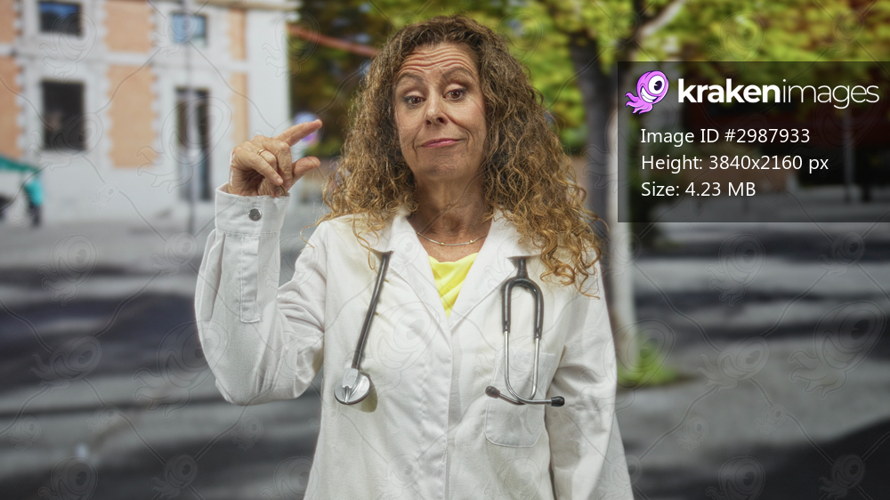 Woman doctor in white lab coat with stethoscope pinches index finger to indicate small amount while standing on a city street; concern.
