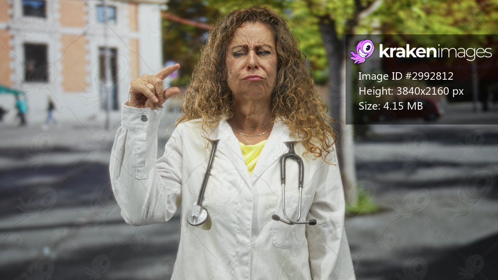 Woman doctor in white lab coat with stethoscope pinches index finger to indicate small amount while standing on a city street; concern.