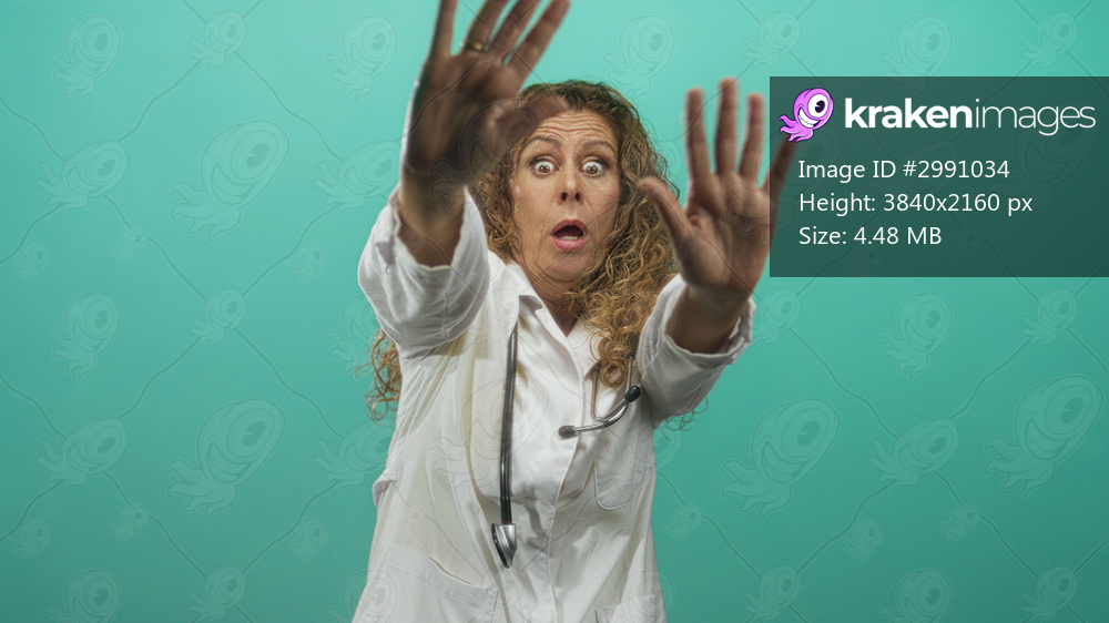 Woman doctor in white lab coat with stethoscope reaches hands forward palms out toward camera in studio; surprise protect caution.