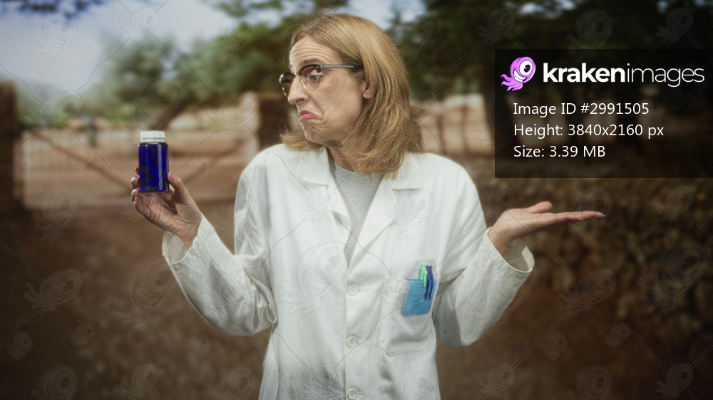 Woman doctor in white labcoat and glasses holding a blue medicine bottle, shrugging with palms up and pens in pocket on a forest path; doubt caution.