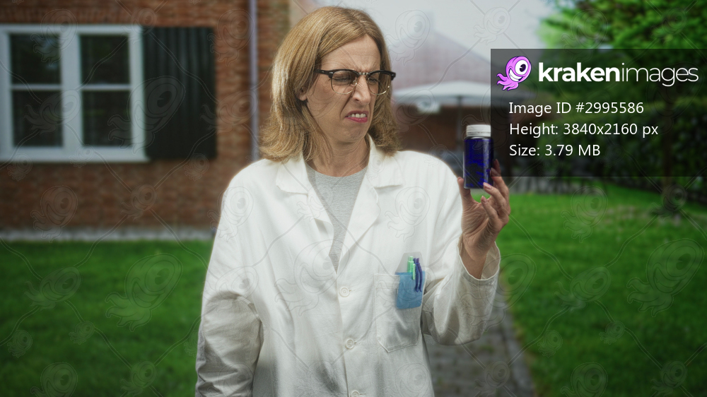 Woman doctor in white labcoat holding blue medicine bottle, frowning and examining the label outside building; safety concern.