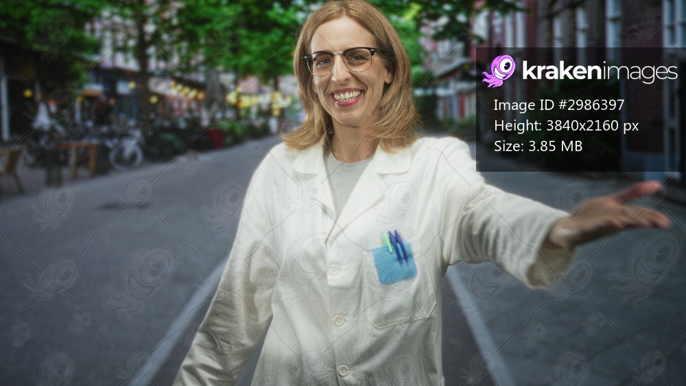 Woman doctor in white labcoat smiling, hands crossed over chest with open palms in a welcoming gesture on a city street; compassionate care.
