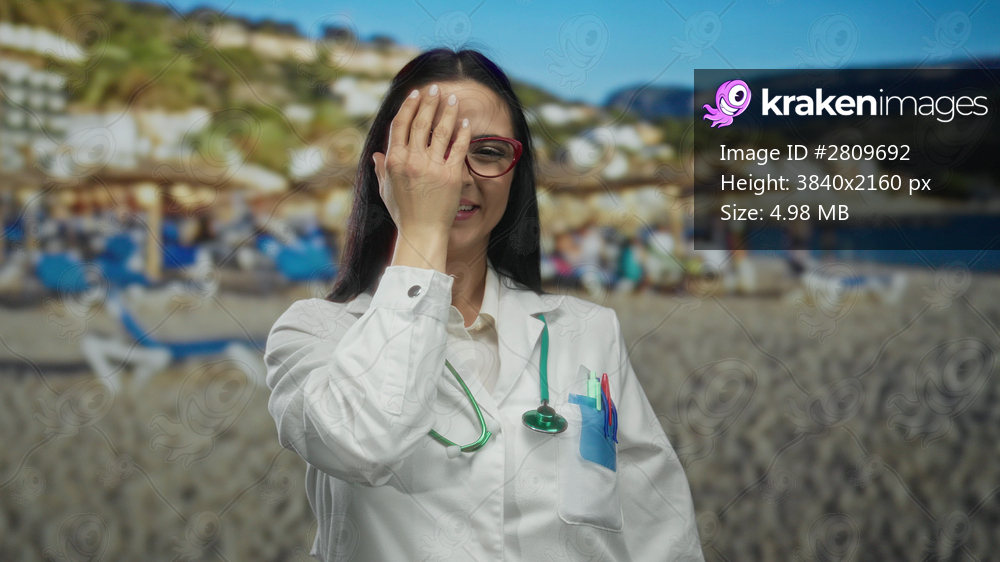 Woman doctor in white uniform with stethoscope covers one eye playfully, standing outdoors against a sunny beach backdrop, embodying a blend of professional and casual atmospheres. - Kraken Images