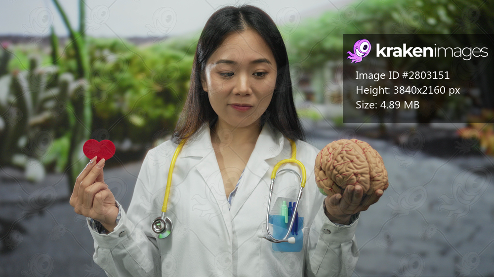 Woman doctor in white uniform with stethoscope holding brain and heart paper outdoors in green park setting, highlighting medical and health themes with focus on young chinese female. - Kraken Images