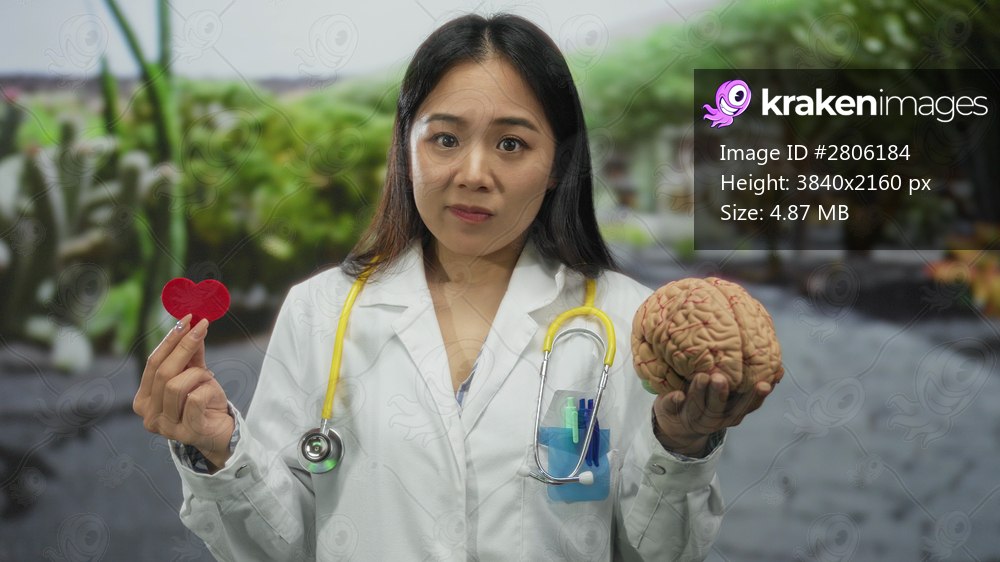 Woman doctor in white uniform with stethoscope holding brain and heart paper outdoors in green park setting, highlighting medical and health themes with focus on young chinese female. - Kraken Images