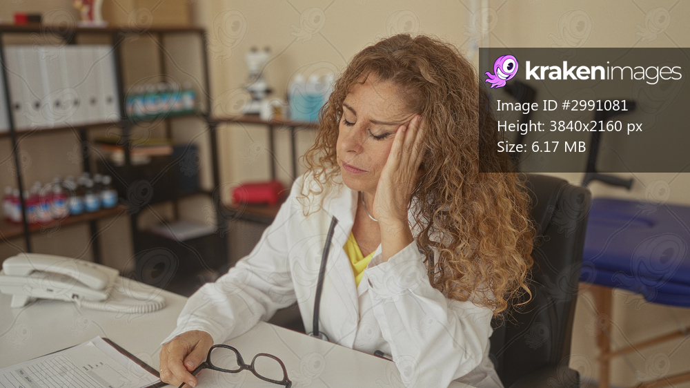 Woman doctor in whitecoat removes glasses and rubs temples at clinic desk beside telephone, clipboard and exam table with stethoscope visible; fatigue stress. - Kraken Images