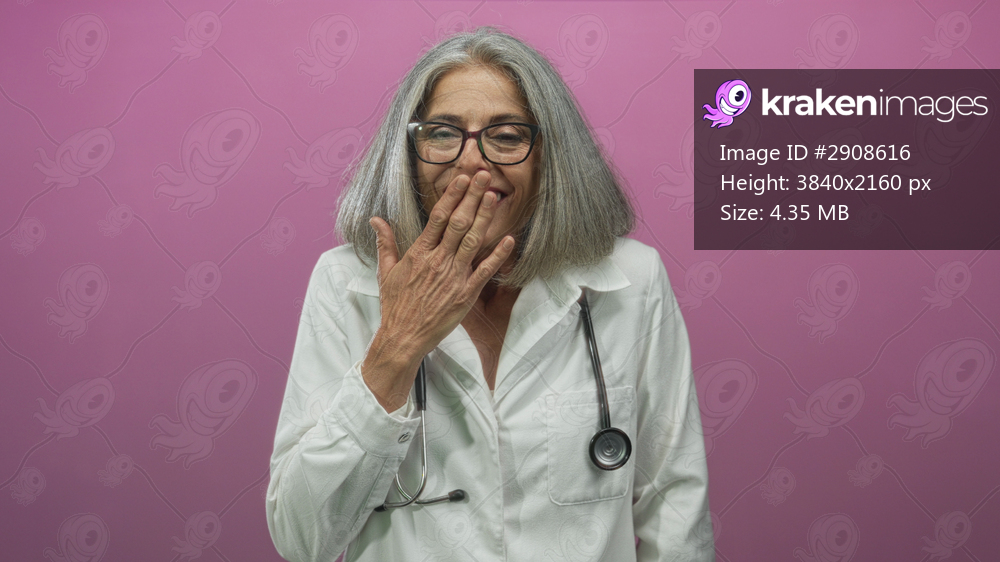 Woman doctor, middle aged grey haired, wearing stethoscope and glasses, covering mouth with hand in pink studio; amused caring empathy.
