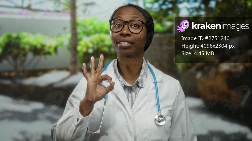 Woman doctor outdoors wearing glasses and white coat with stethoscope making okay gesture with natural background