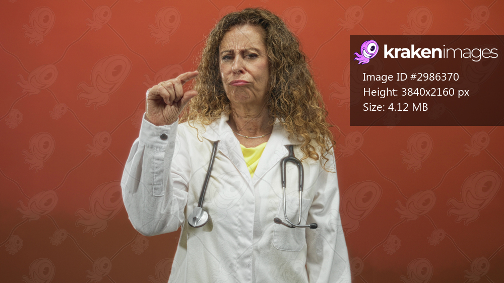 Woman doctor pinches fingers to show a small amount, stethoscope hanging on lab coat in studio with red wall; skepticism.