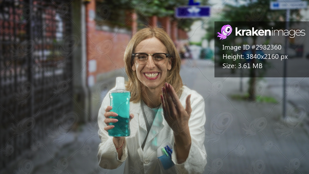 Woman doctor pointing finger at camera while holding blue mouthwash bottle on a city street; playful wellness reminder.