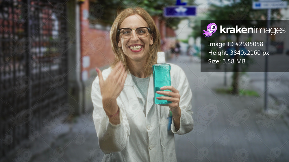 Woman doctor pointing finger at camera while holding blue mouthwash bottle on a city street; playful wellness reminder.