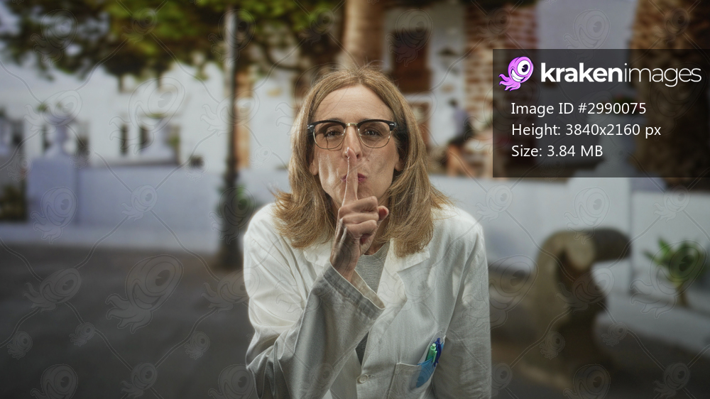 Woman doctor points finger then finger to lips for silence on a street while wearing lab coat and glasses; private silence.