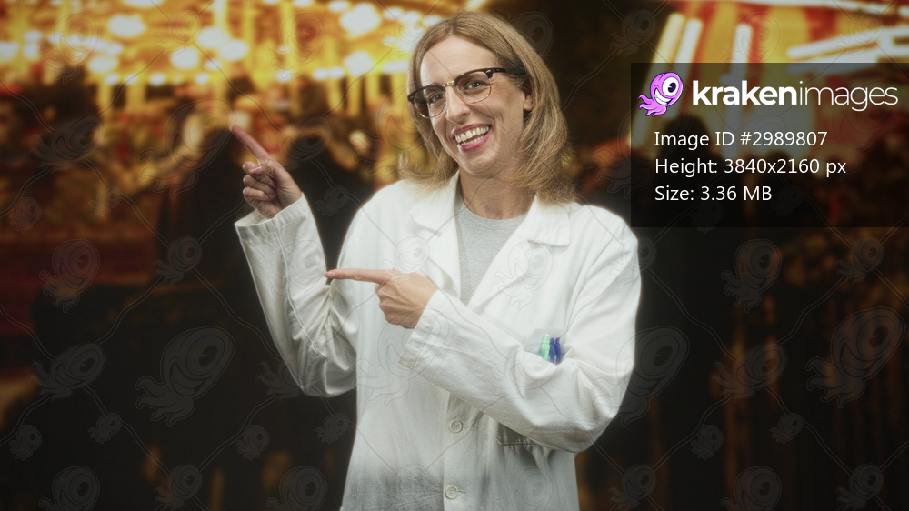 Woman doctor points finger to right in street carnival, smiling in white labcoat with pens and glasses visible; curiosity cheerful.