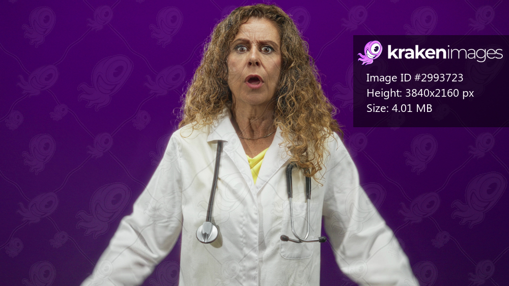 Woman doctor points fingers to chest with stethoscope in studio purple backdrop; surprise awareness.