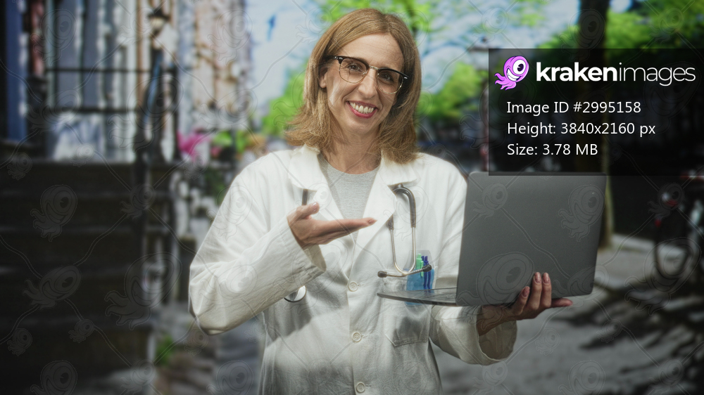 Woman doctor presenting laptop with hand palm up on street, wearing lab coat and stethoscope; reassurance telemedicine care.