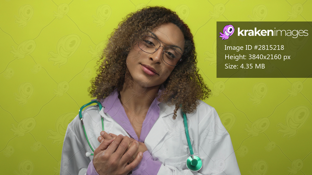 Woman doctor presses a green stethoscope against her chest with eyes closed in a studio; serenity introspection.