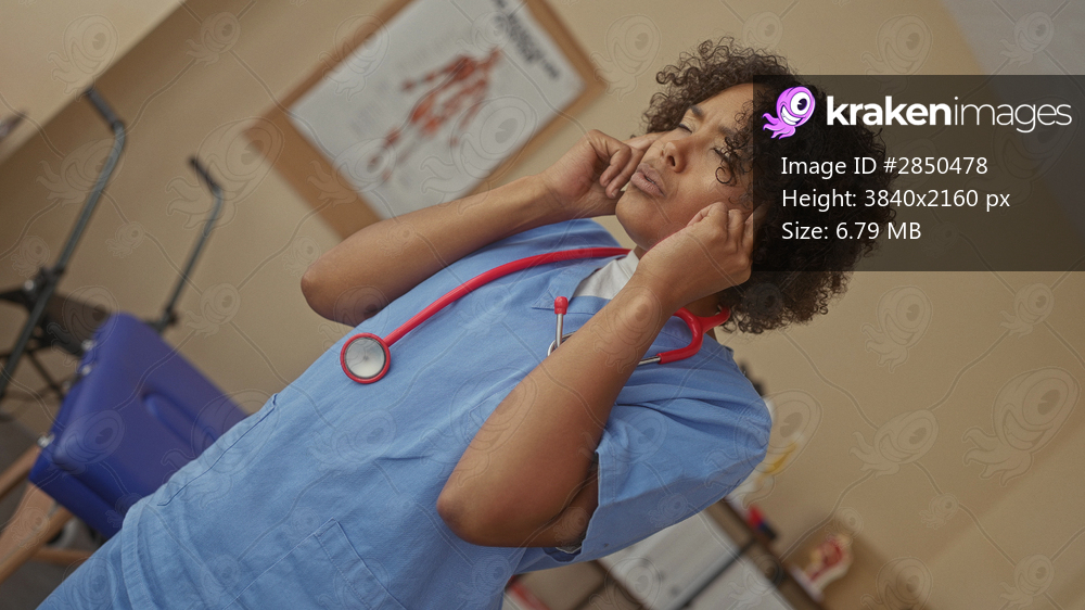 Woman doctor presses temples in medical building hallway under anatomical chart with red stethoscope draped over neck; stress and fatigue.