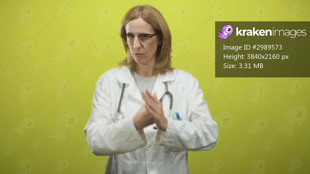 Woman doctor rubbing hands with stethoscope, wearing white coat and glasses in studio; concern hygiene precaution.