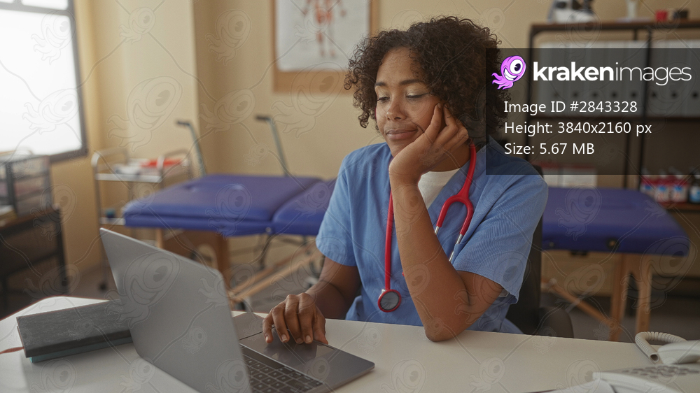 Woman doctor scrolling electronic records at laptop with hand on cheek inside clinic building; fatigue.