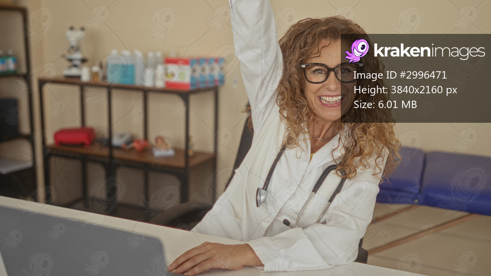 Woman doctor smiles and raises arm with stethoscope while seated at clinic building desk; compassion care joy.