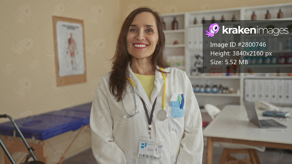 Woman doctor smiling confidently in a hospital office with medical equipment and files organized on shelves, wearing a lab coat and stethoscope, symbolizing healthcare professionalism. - Kraken Images