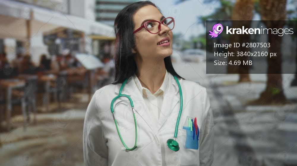Woman doctor smiling on a street terrace, wearing a stethoscope and uniform, with outdoor restaurant and coffee shop ambiance blending medical professionalism and urban lifestyle. - Kraken Images