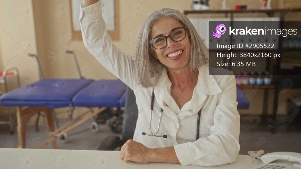 Woman doctor smiling and raising arm with stethoscope, seated at desk in clinic building; compassionate care joy.